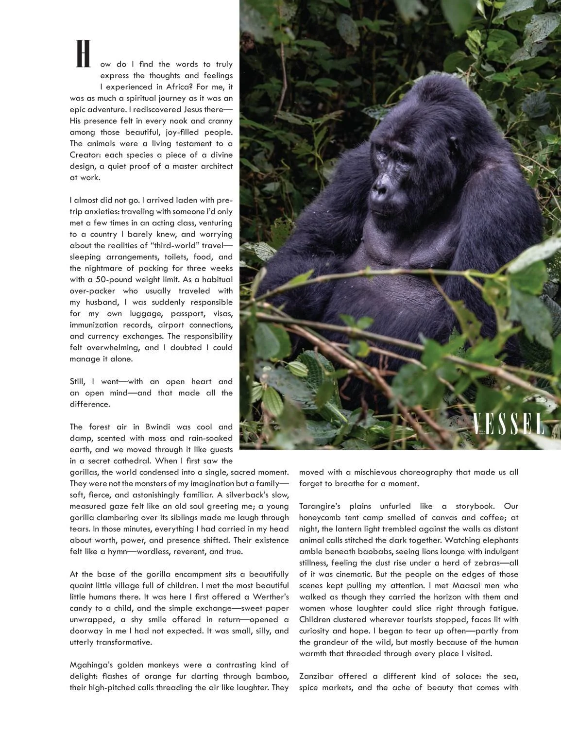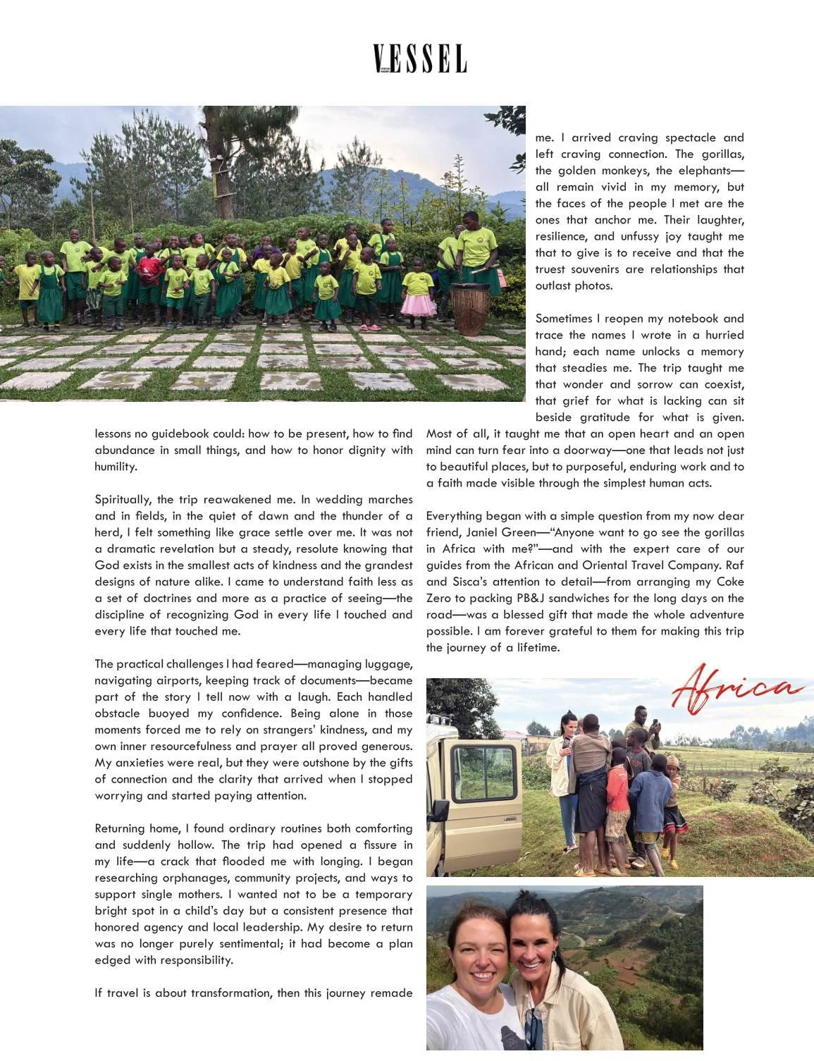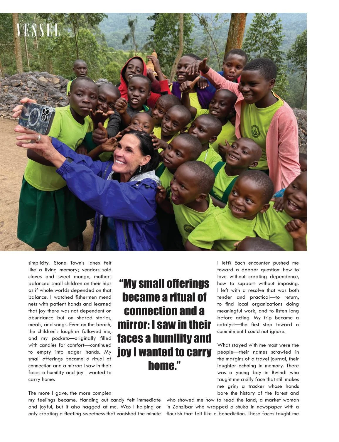 In her Vessel Magazine feature, Tawna Kelley shares a deeply personal story of transformation through her travels across Africa — a journey that became both an adventure and a spiritual awakening. From the mist-covered forests of Bwindi to the vibrant streets of Zanzibar, Tawna’s reflections go beyond the breathtaking landscapes; they capture the soul of connection, humility, and rediscovered faith.